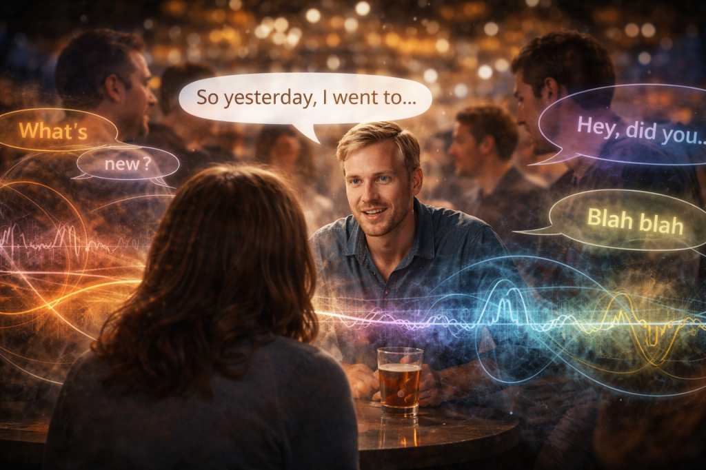 Many autistic people struggle with something called auditory processing in complex environments. When there are multiple competing sounds—music, clinking glasses, multiple conversations—our brains can struggle to filter out background noise.